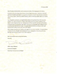 Last month Rabbi Ron wrote about his visit to Navel Base Ventura County. You can see the post here. We wanted to share this thank you note from the Command Chaplain.